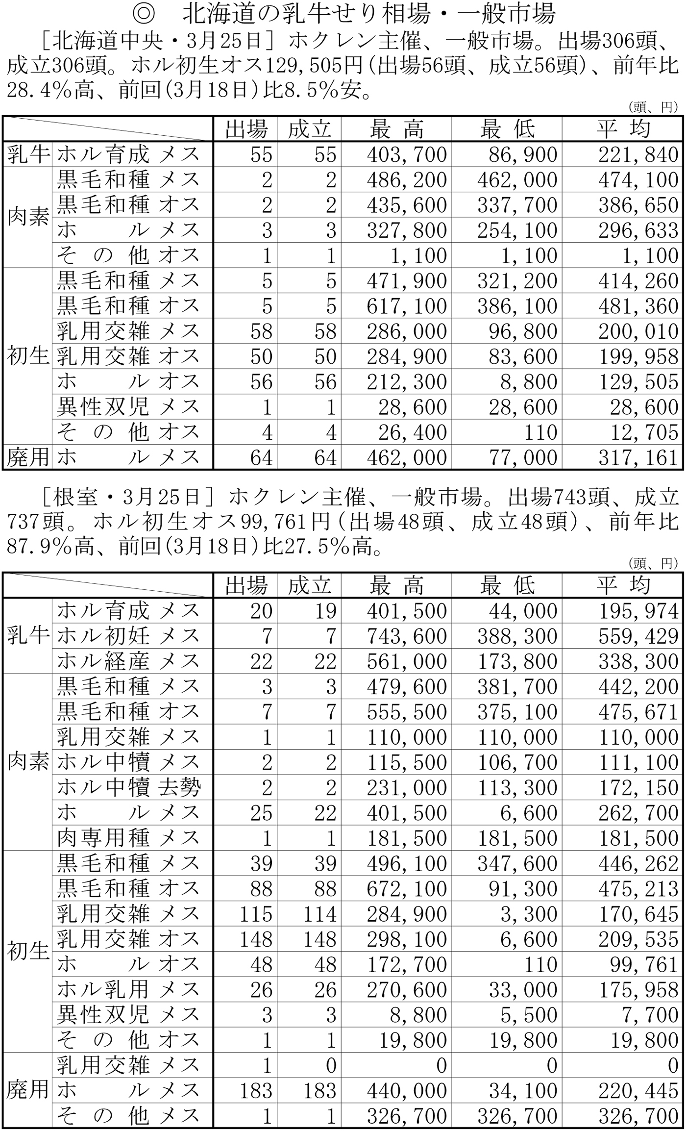 北海道の乳牛せり相場・一般市場(中央・3月25日、根室・3月25日)