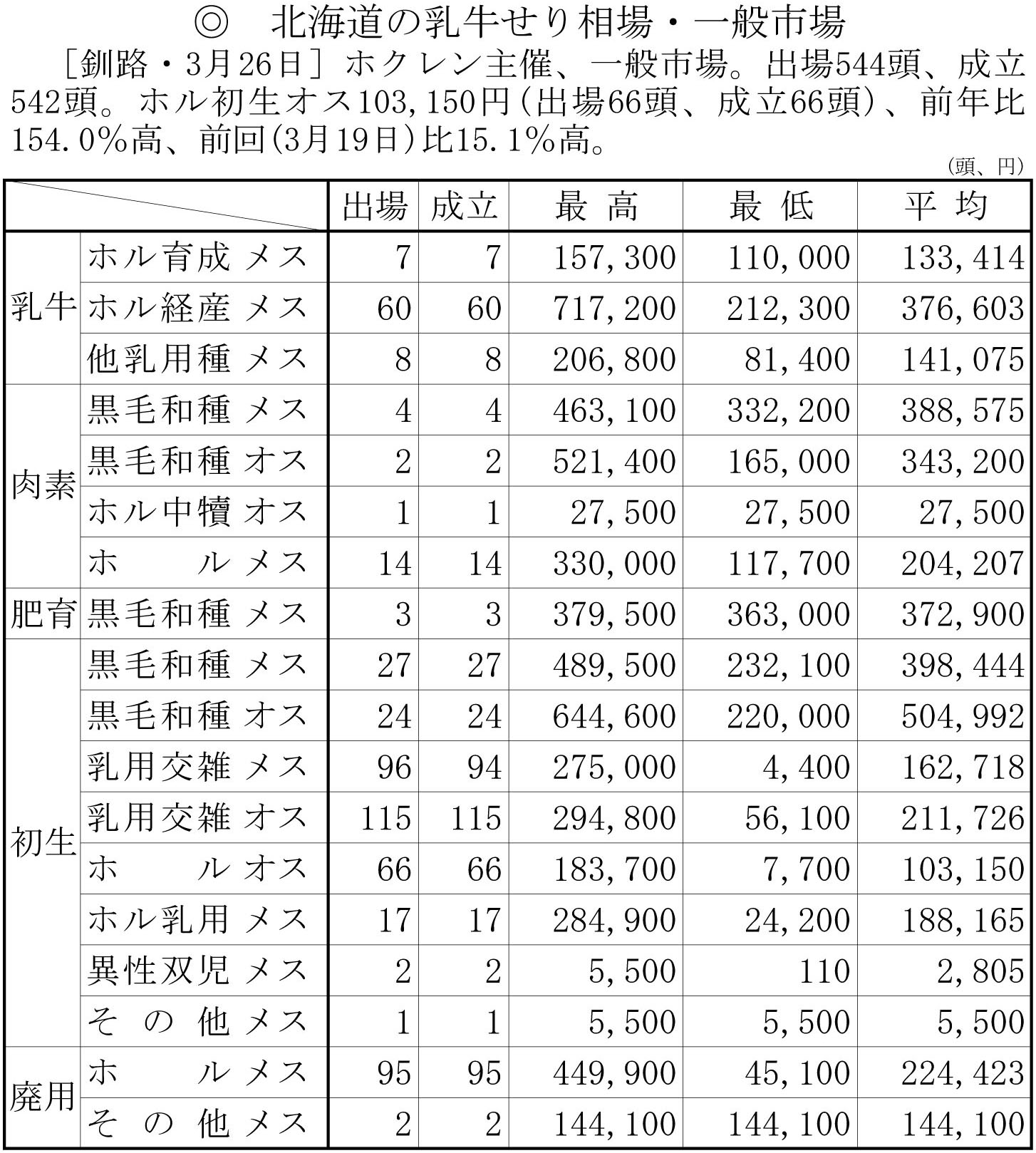 北海道の乳牛せり相場・一般市場(釧路・3月26日)