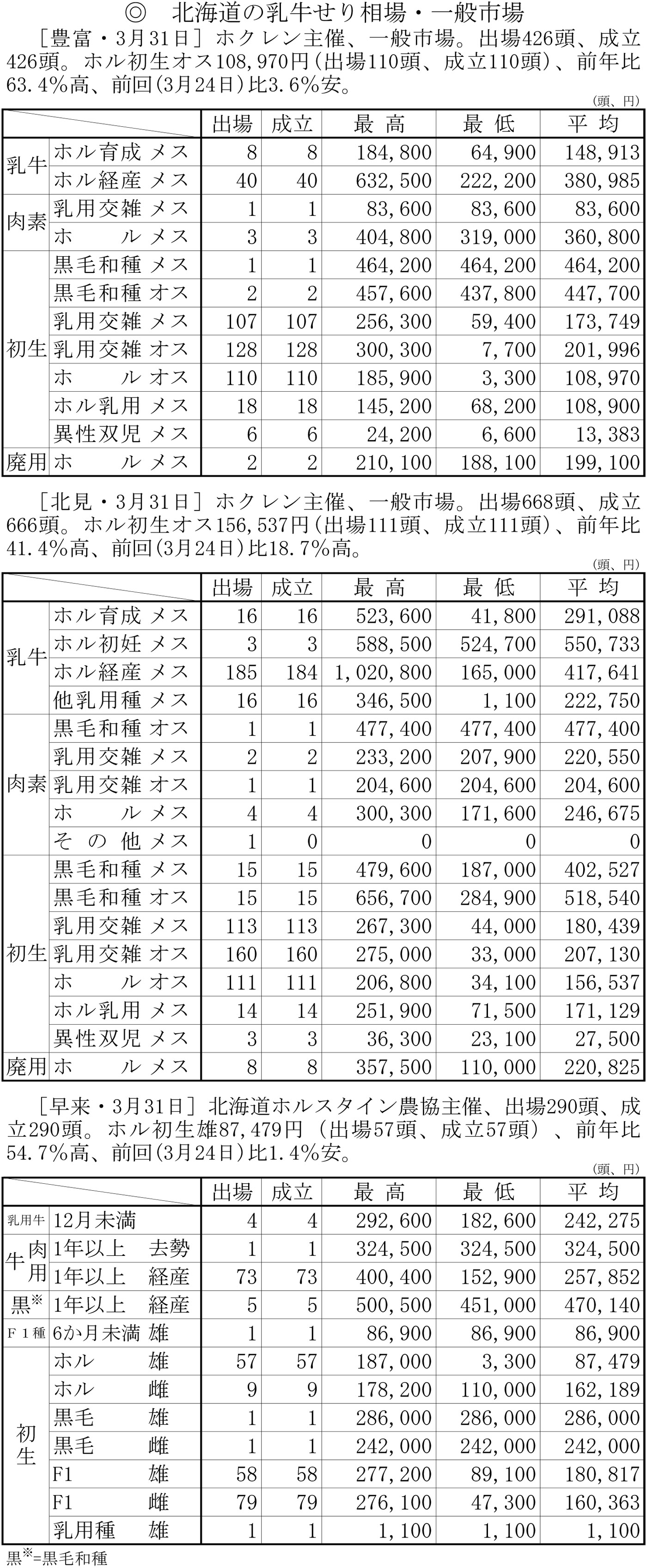 北海道の乳牛せり相場・一般市場(豊富・3月31日、北見・3月31日、早来・3月31日)