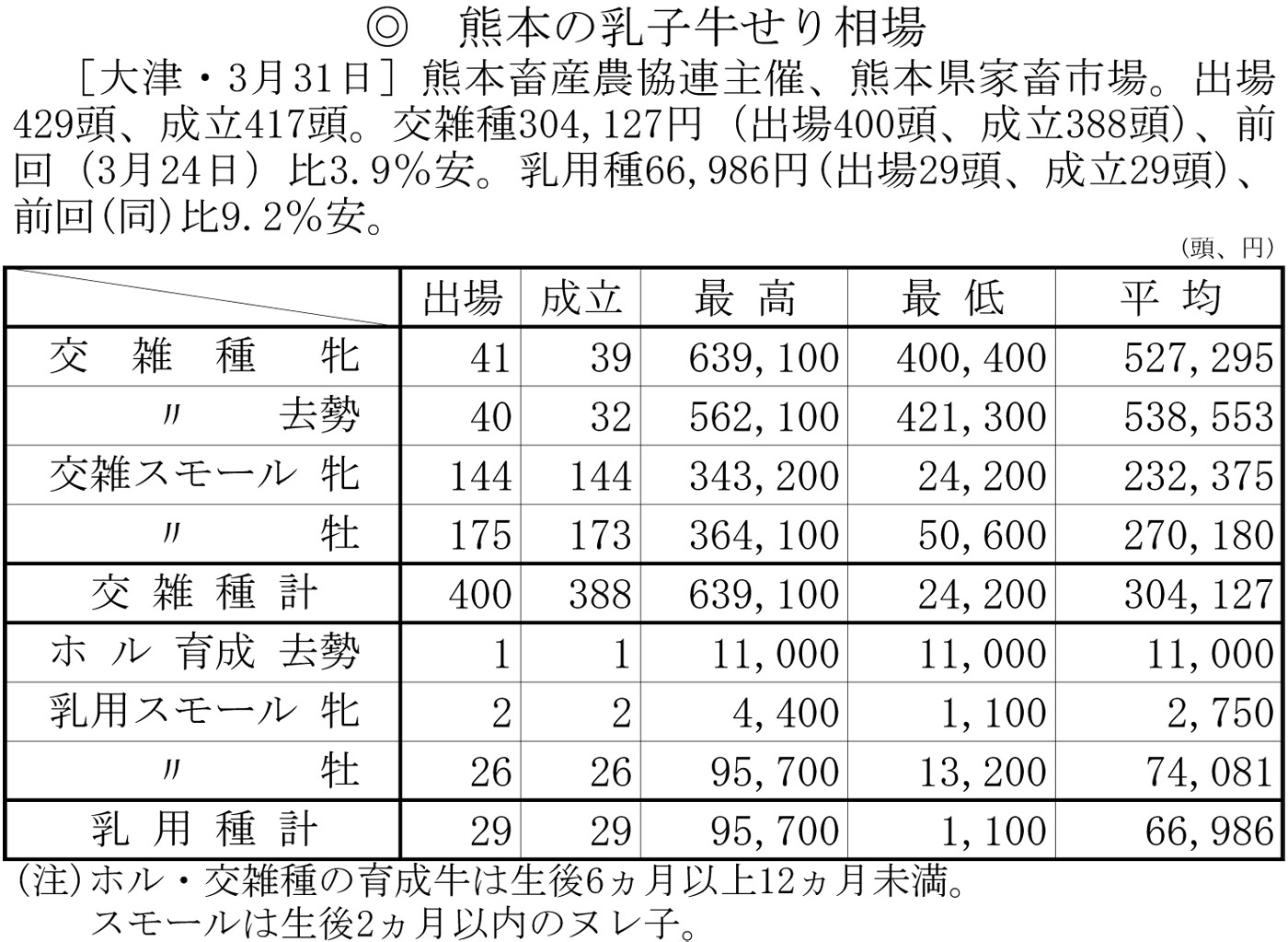 熊本の乳子牛せり相場(大津・3月31日)