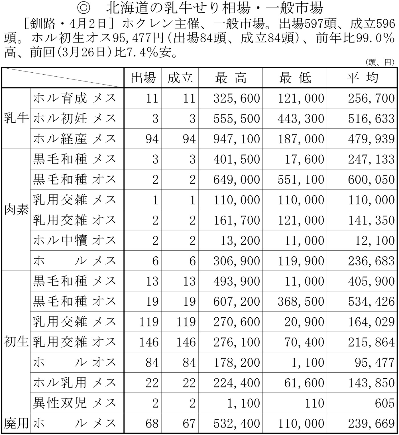 北海道の乳牛せり相場・一般市場(釧路・4月2日)