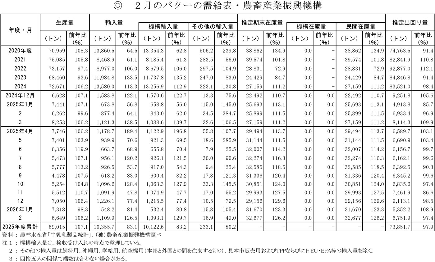 2月のバターの需給表・農畜産業振興機構