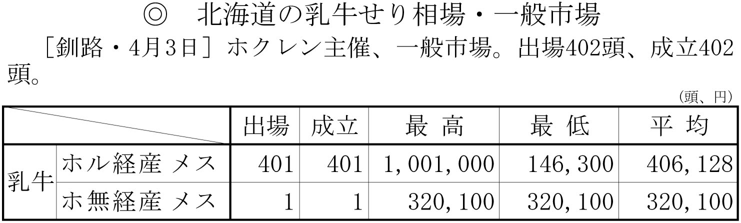 北海道の乳牛せり相場・一般市場(釧路・4月3日)