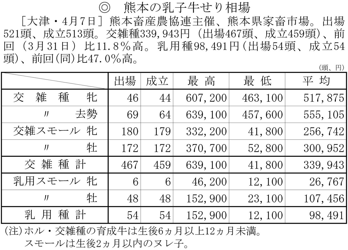 熊本の乳子牛せり相場(大津・4月7日)