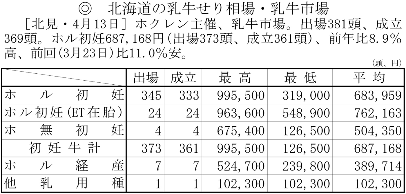 北海道の乳牛せり相場・乳牛市場(北見・4月13日)