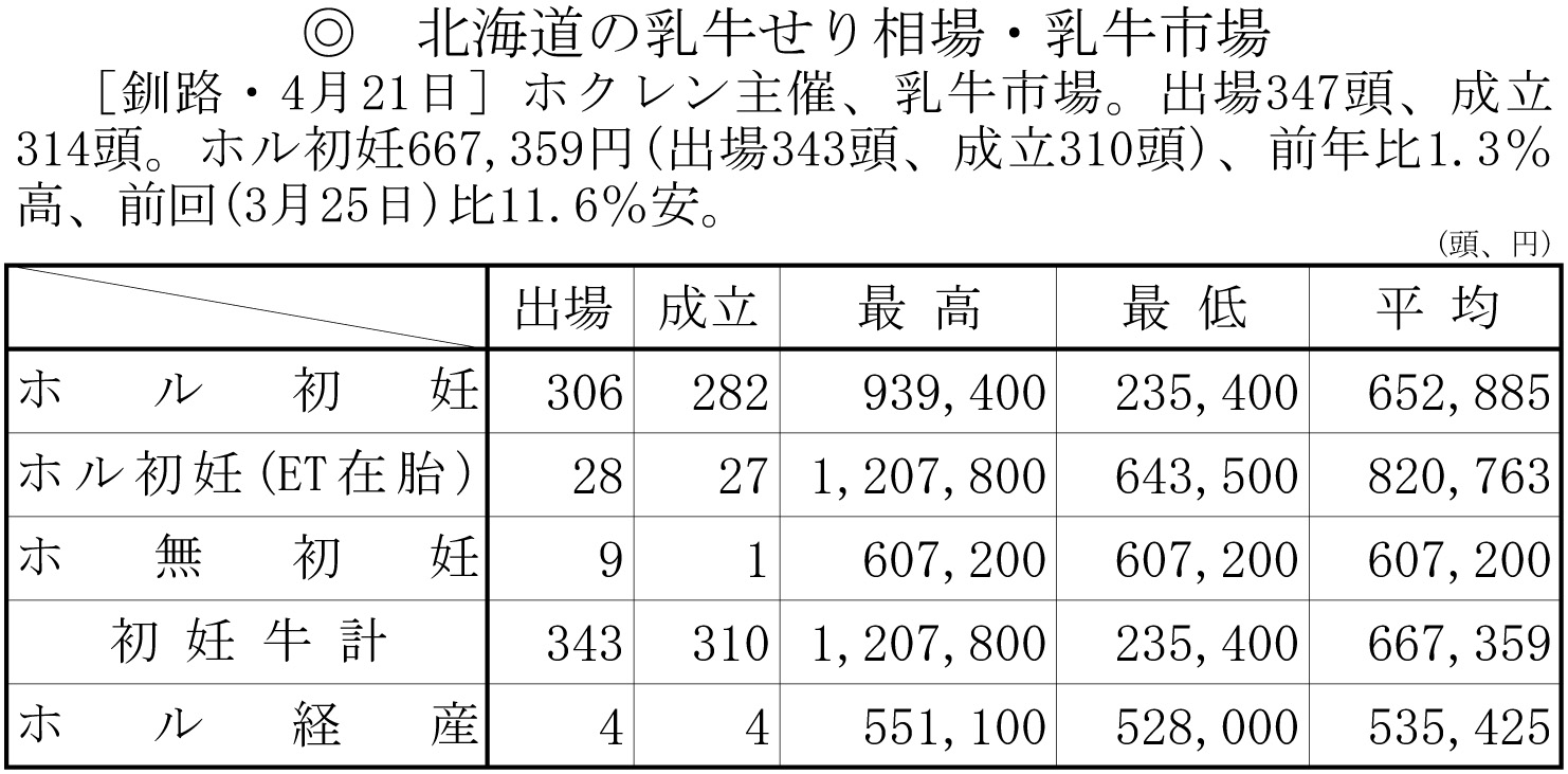 北海道の乳牛せり相場・乳牛市場(釧路・4月21日)