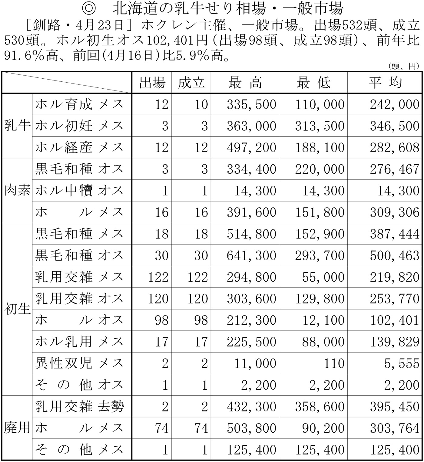 北海道の乳牛せり相場・一般市場(釧路・4月23日)