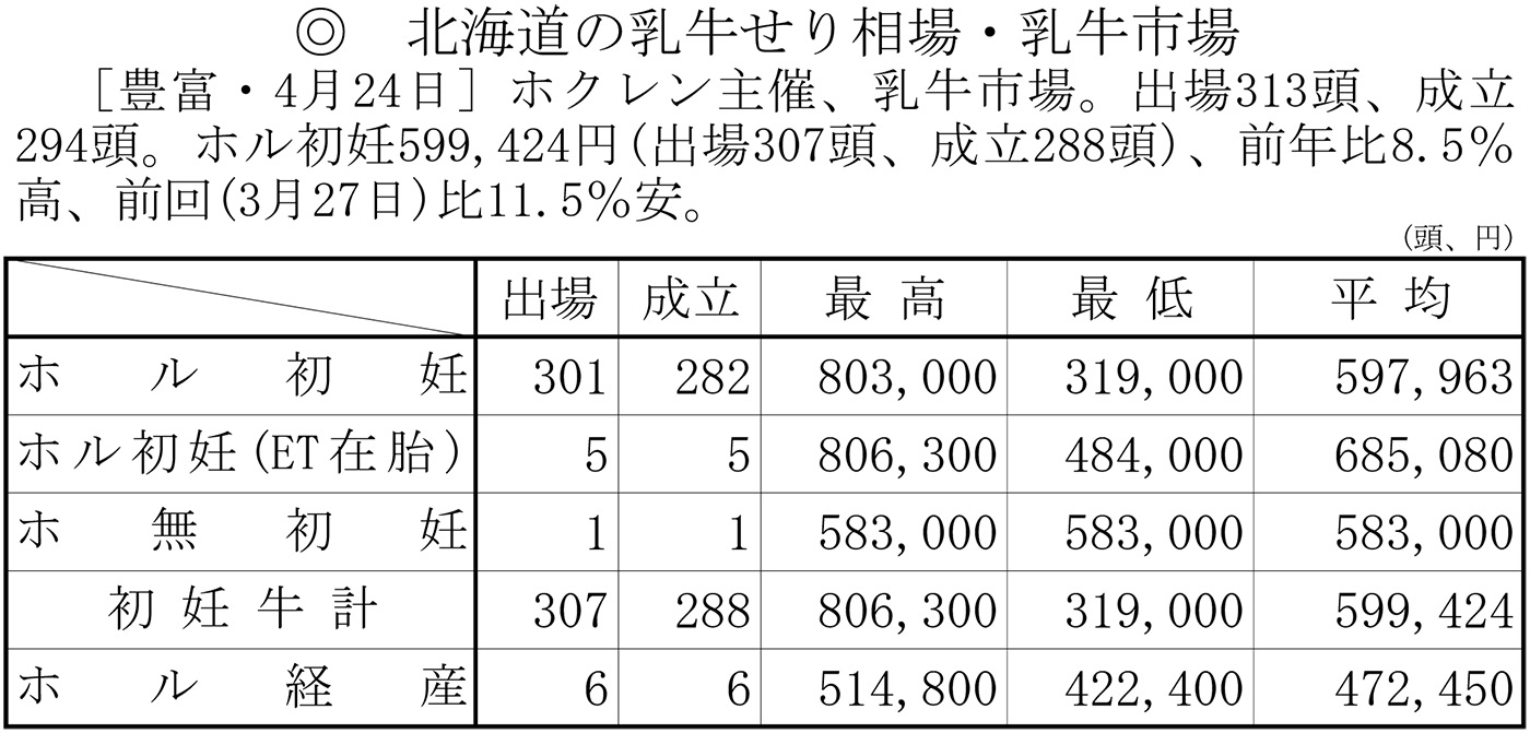 北海道の乳牛せり相場・乳牛市場(豊富・4月24日)