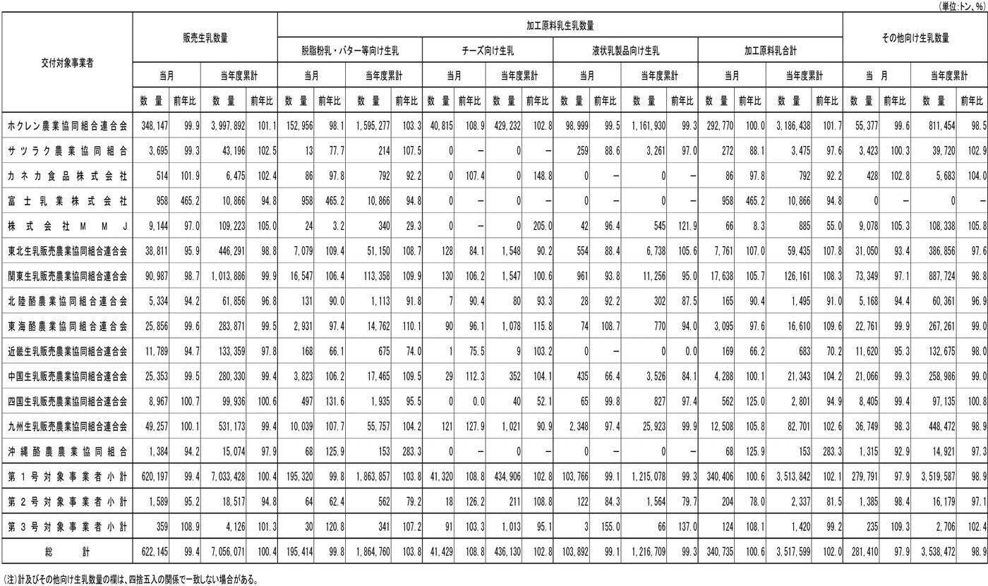 3月の交付対象事業者別販売生乳数量等・機構